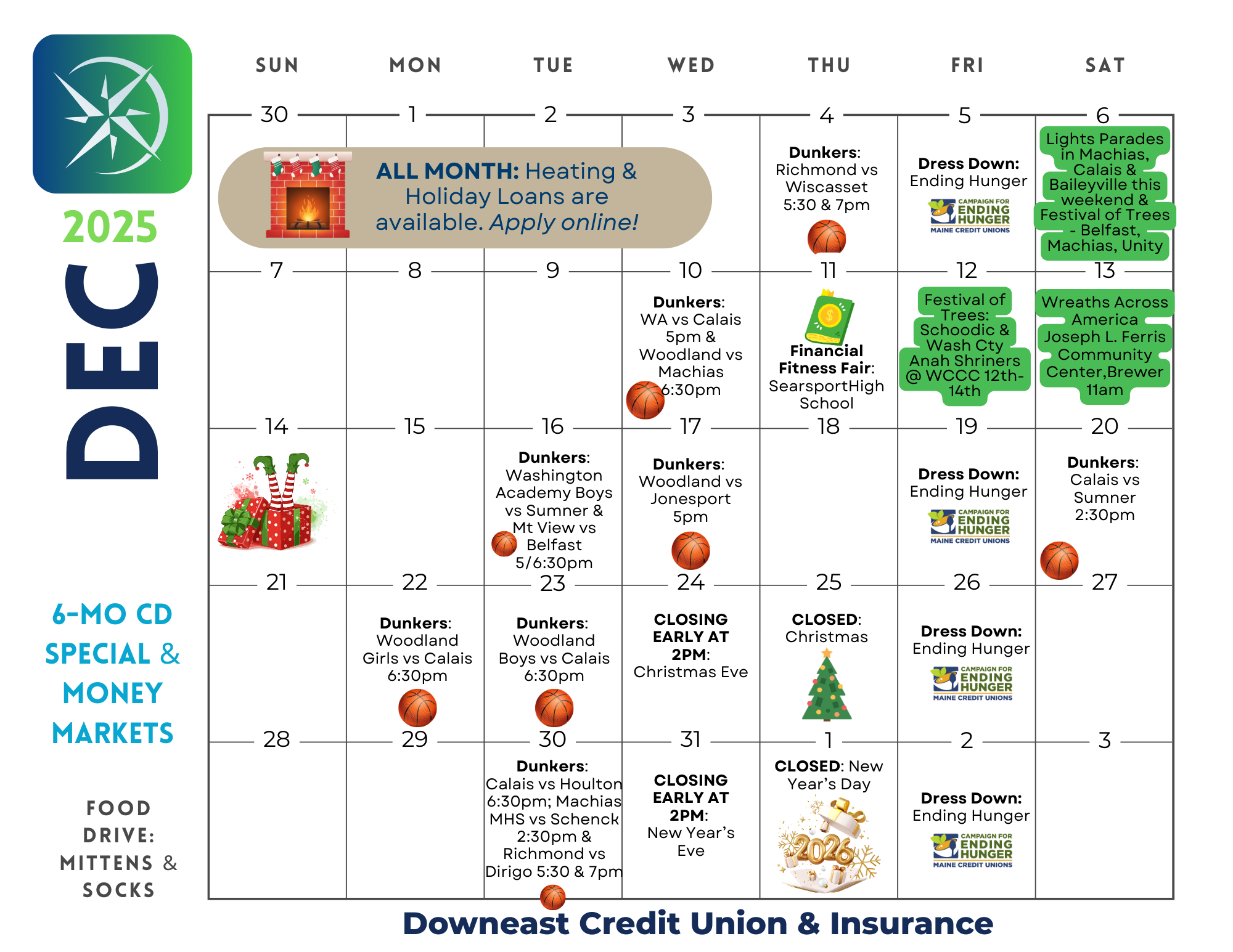 Downeast Credit Union is a Maine Credit Union serving Washington, Waldo, Hancock, Penobscot, Lincoln, Kennebec, Sagadahoc, and Knox Counties, and the towns of Brunswick and Harpswell in Cumberland County. Branch offices are located in Baileyville, Belfast, Brewer, Calais, Machias, Richmond, Topsham and Unity.